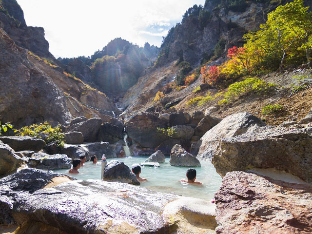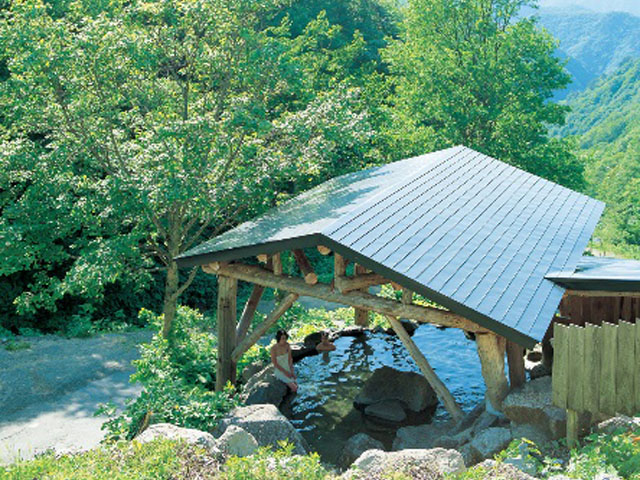 A hidden hot spring nestled in the mountain paradise of the Azuma range. Located along the headwaters of the Mogami River, the open-air baths here enjoy abundant spring water. A waterfall can be found just a short distance above the inn, offering a beautifully scenic secret spring. (Closed in winter)